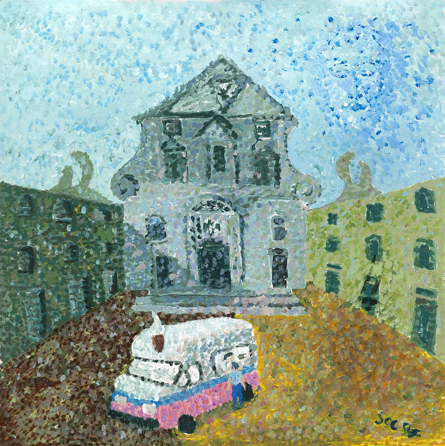 “Idealism and the picture plane’ is my struggle to say something new about the picture plane. They are a sequence whereby perspective and composition become more extreme, from simple idealism to almost surrealism. There was a visual aspect to this, firstly to see the optical effect of applying paint in a pointillist fashion and its dynamism with exaggerated perspective.